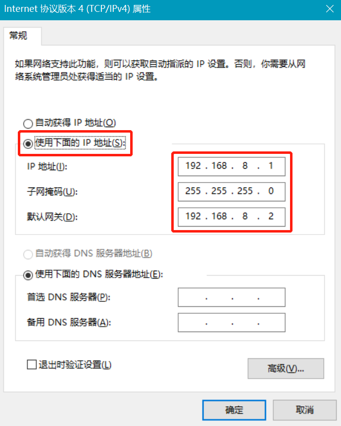 选择手动输入IP地址,修改默认网关为之前和子网掩码为之前修改虚拟机网络时的信息。
