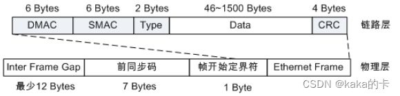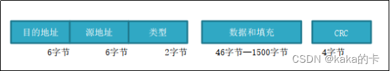 | Data | 变长 | 数据字段的最小长度必须为46字节以保证帧长至少为64字节,这意味着传输一字节信息也必须使用46字节的数据字段。 如果填入该字段的信息少于46字节,该字段的其余部分也必须进行填充。数据字段的最大长度为1500字节。 |