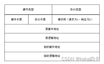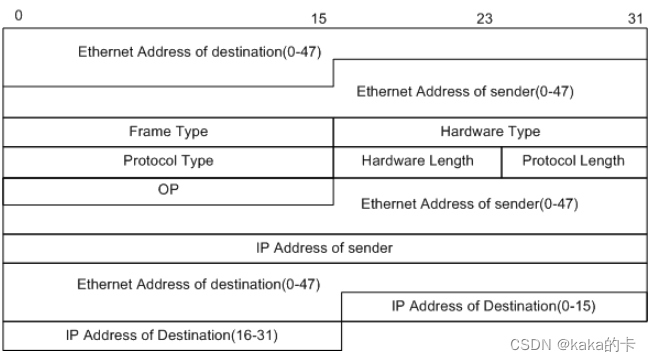 | OP | 16比特 | 操作类型: 1 ARP请求 2 ARP应答 3 RARP请求 4 RARP应答 |