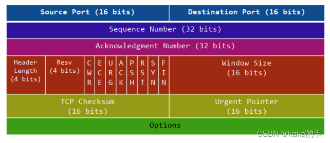 | Checksum | 16比特 | 校验字段,包括TCP首部和TCP数据,是一个强制性的字段,一定是由发端计算和存储,并由收端进行验证。在计算检验和时,要在TCP报文段的前面加上12字节的伪首部。 |