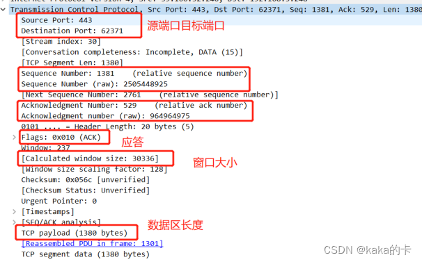 Seq:数据段的序号,当接收端收到乱序的包,就能根据此序号重新排序,当前Seq等上一个Seq号与长度相加获取到