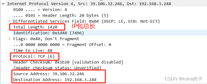 | Total Length | 16比特 | 总长度,整个IP数据报的长度,包括首部和数据之和,单位为字节,最长65535,总长度必须不超过最大传输单元MTU。 |