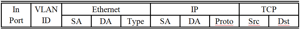 在“类型0”交换机中,流头是表1中所示的10元组。TCP流可以由所有十个字段指定,而IP流在其定义中可能不包括传输端口。 每个标头字段可以是通配符,以允许流的聚合,例如仅定义VLAN ID的流将应用于特定VLAN上的所有通信。