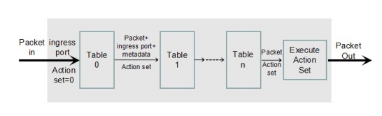 当报文进入Switch后,必须从最小的Flow Table开始依次匹配。Flow Table可以按次序从小到大越级跳转,但不能从某一Flow Table向前跳转至编号更小的Flow Table。当报文成功匹配一条Flow Entry后,将首先更新该Flow Entry对应的统计数据(如成功匹配数据包总数目和总字节数等),然后根据Flow Table中的指令进行相应操作,比如跳转至后续某一Flow Table继续处理,修改或者立即执行该数据包对应的Action Set等。当数据包已经处于最后一个Flow Table时,其对应的Action Set中的所有Action将被执行,包括转发至某一端口,修改数据包某一字段,丢弃数据包等。具体实现时,OpenFlow交换机还需要对匹配表项次数进行计数、更新匹配集和元数据等操作。
