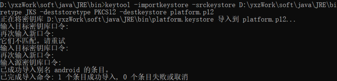 keytool -v -importkeystore -srckeystore D:\yxzWork\soft\java\JRE\bin\platform.p12 -srcstoretype PKCS12 -destkeystore platform.jks -deststoretype JKS