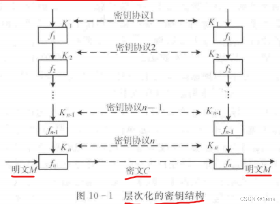 可以这样来理解层次化的密钥结构:某一层密钥Ki相对于更高层的密钥Ki-1是工作密码,而相对于底一层的密钥Ki+1是密钥加密密钥。