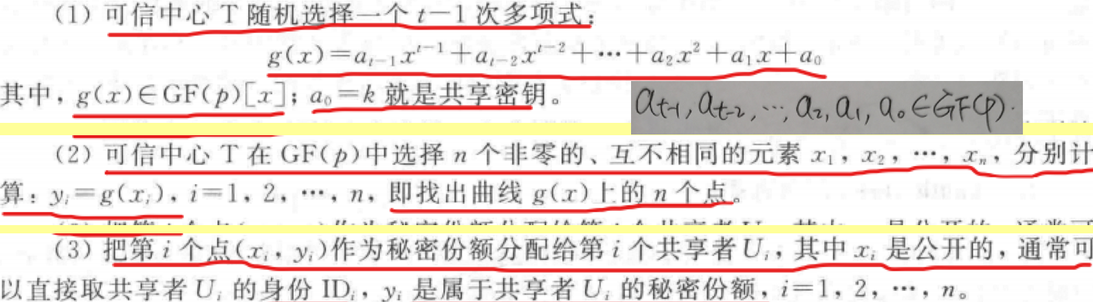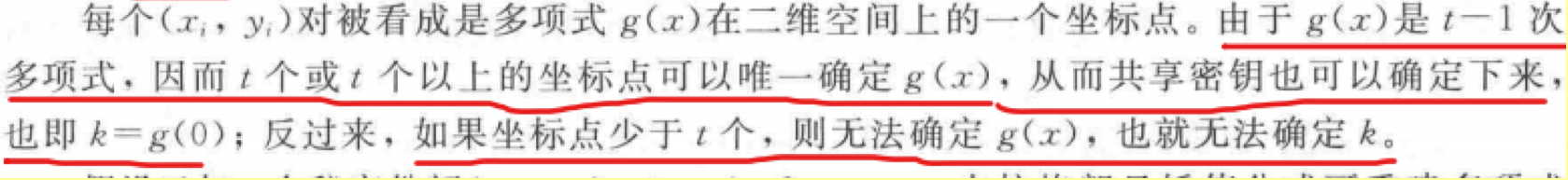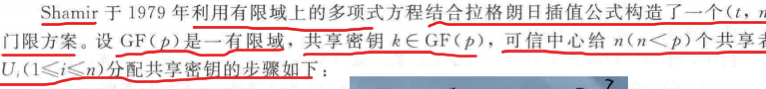 为了解决这样一些问题,入门引用了(t,n)门限方案,基本思想:预先由需要保护的共享秘密产生n份秘密,并且这n份中任意t个就可以重构共享秘密。