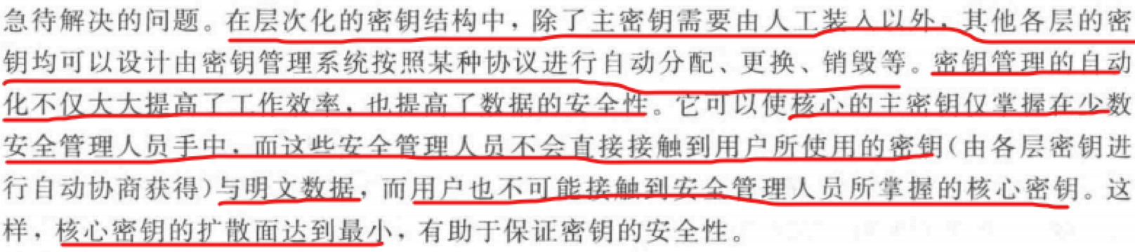 层次化的密钥结构意味着以密钥来保护密钥。主密钥可以以明文的形式存储在有严密物理保护的主机密码器件中。