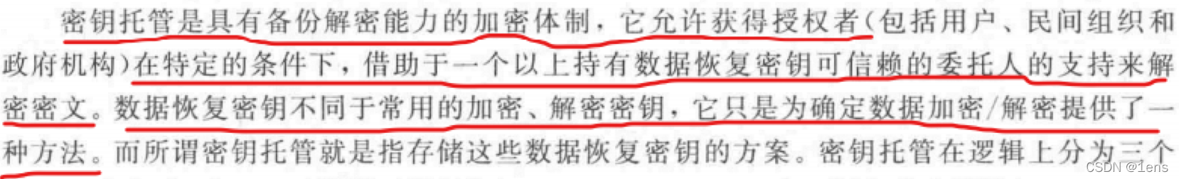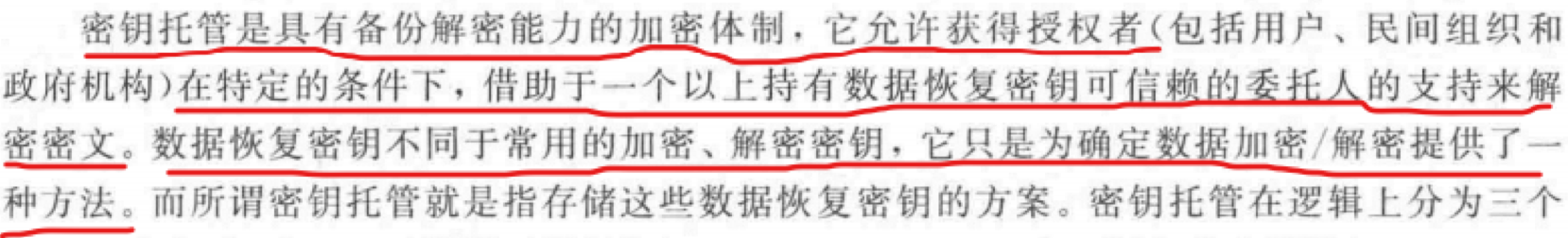 密钥托管提供了一种密钥备份与恢复的途径,也称为托管加密,在用户的密钥丢失或者损坏的情况下可通过密钥托管技术恢复自己的密钥。