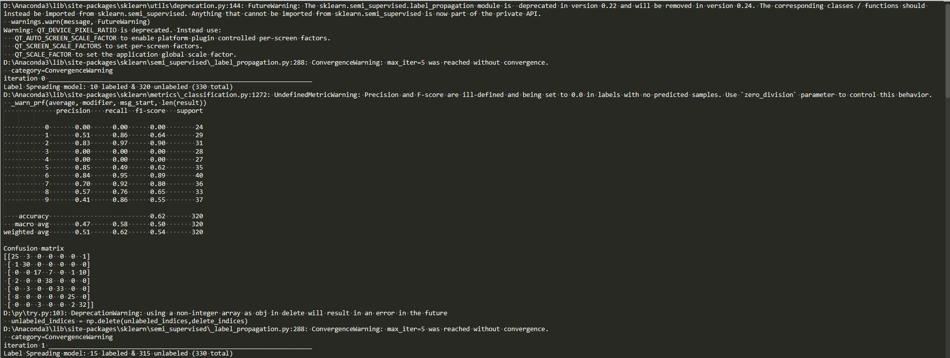 不过我在这里先打击大家一下,用sklearn的包做不了大数据量的半监督学习,我用的数据量大概在15000条以上就要报MemoryError错误了,这个是我最讨厌的错误。暂时我还没有解决的办法,如果同志们是小数据量,那就用这个做着玩玩吧