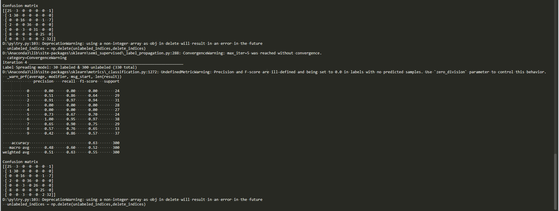 import numpy as np import matplotlib.pyplot as plt from scipy import stats from sklearn import datasets from sklearn.semi_supervised import label_propagation from sklearn.metrics import classification_report,confusion_matrix# 再加下面这个,不然会报错 from scipy.sparse.csgraph import *digits = datasets.load_digits() rng = np.random.RandomState(0)# indices是随机产生的0-1796个数字,且打乱 #indices:[1081 1707 927 ... 1653 559 684] indices = np.arange(len(digits.data)) rng.shuffle(indices)# 取前330个数字来玩 X = digits.data[indices[:330]] y = digits.target[indices[:330]] images = digits.images[indices[:330]]n_total_samples = len(y) # 330 n_labeled_points = 10 # 标注好的数据共10条 max_iterations = 5 # 迭代5次#未标注的数据320条 #即[10 11 12 ... 329] unlabeled_indices = np.arange(n_total_samples)[n_labeled_points:] f = plt.figure() # 画图用的for i in range(max_iterations):if len(unlabeled_indices) == 0:print("no unlabeled items left to label") # 没有未标记的标签了,全部标注好了breaky_train = np.copy(y)y_train[unlabeled_indices] = -1 #把未标注的数据全部标记为-1,也就是后320条数据lp_model = label_propagation.LabelSpreading(gamma=0.25,max_iter=5) # 训练模型lp_model.fit(X,y_train)predicted_labels = lp_model.transduction_[unlabeled_indices] # 预测的标签true_labels = y[unlabeled_indices] # 真实的标签print('**************************')print(predicted_labels)print(true_labels)print('**************************')cm = confusion_matrix(true_labels,predicted_labels,labels = lp_model.classes_)print("iteration %i %s" % (i,70 * "_")) # 打印迭代次数print("Label Spreading model: %d labeled & %d unlabeled (%d total)"% (n_labeled_points,n_total_samples-n_labeled_points,n_total_samples))print(classification_report(true_labels,predicted_labels))print("Confusion matrix")print(cm)# 计算转换标签分布的熵# lp_model.label_distributions_作用是Categorical distribution for each itempred_entropies = stats.distributions.entropy(lp_model.label_distributions_.T)# 选择分类器最不确定的前5位数字的索引# 首先计算出所有的熵,也就是不确定性,然后从320个中选择出前5个熵最大的# numpy.argsort(A)提取排序后各元素在原来数组中的索引。具体情况可看下面# np.in1d 用于测试一个数组中的值在另一个数组中的成员资格,返回一个布尔型数组。具体情况可看下面uncertainty_index = np.argsort(pred_entropies)[::1]uncertainty_index = uncertainty_index[np.in1d(uncertainty_index,unlabeled_indices)][:5] # 这边可以确定每次选前几个作为不确定的数,最终都会加回到训练集# 跟踪我们获得标签的索引delete_indices = np.array([])# 可视化前5次的结果if i < 5:f.text(.05,(1 - (i + 1) * .183),'model %d\n\nfit with\n%d labels' %((i + 1),i*5+10),size=10)for index,image_index in enumerate(uncertainty_index):# image_index是前5个不确定标签# index就是0-4image = images[image_index]# 可视化前5次的结果if i < 5:sub = f.add_subplot(5,5,index + 1 + (5*i))sub.imshow(image,cmap=plt.cm.gray_r)sub.set_title("predict:%i\ntrue: %i" % (lp_model.transduction_[image_index],y[image_index]),size=10)sub.axis('off')# 从320条里删除要那5个不确定的点# np.where里面的参数是条件,返回的是满足条件的索引delete_index, = np.where(unlabeled_indices == image_index)delete_indices = np.concatenate((delete_indices,delete_index))unlabeled_indices = np.delete(unlabeled_indices,delete_indices)# n_labeled_points是前面不确定的点有多少个被标注了n_labeled_points += len(uncertainty_index)f.suptitle("Active learning with label propagation.\nRows show 5 most""uncertain labels to learn with the next model") plt.subplots_adjust(0.12,0.03,0.9,0.8,0.2,0.45) plt.show()