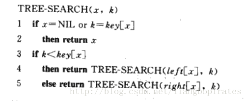 我们先来看一下查找:给定一个树的树根指针x和关键字k,返回指向关键字的指针,否则返回NIL。 TREE-SEARCH(x,k)伪代码