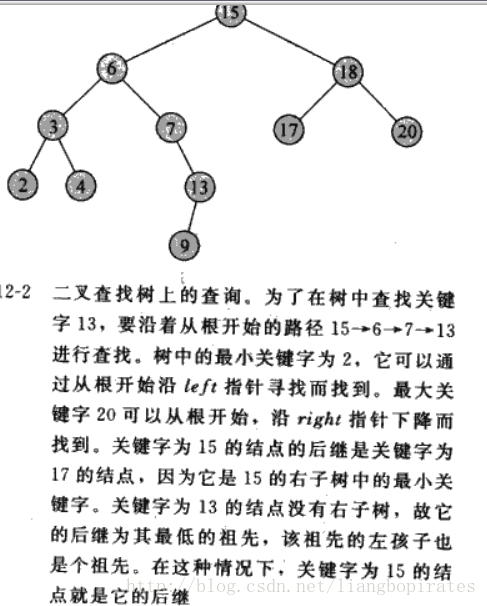 伪代码 TREE-PREDECESSOR(x) 1 if left[x]≠NIL 2 then return TREE-MAXIMUM(left[x]) 3 y←p[x] 4 while y≠NIL and x=left[y] 5 do x←y 6 y←p[y] 7 return y 时间复杂度都是O(H),就是一条自结点向上的路径罢了。 综上所述 对于一颗高度为H的二叉查询树来说,静态操作SEARCH,MINIMUN,MAXIMUM,SUCCESSOR,PREDECESSOR等用时都是O(H)。 对于一颗二叉树,要的不仅仅是静态操作,还需要动态操作。因为必然会有插入和删除操作,而且还要保持二叉排序树的性质。