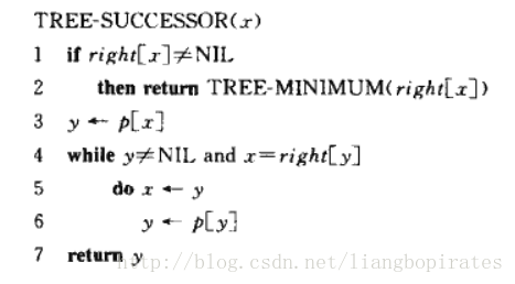 先说后继,对于一个结点X来说,后继无非是有3种情况: 1 X有右孩子,那么X的后继就是右孩子的最左结点。 2 X无右孩子,而且X是其父母的左孩子,那么X后继就是其父母结点(可能NIL)。 3 X无右孩子,而且X是其父母的右孩子,那么X的后继就是X的某个祖先(这个最低祖先的左孩子也是X的祖先),此时让父母成为新的X,寻找不断找X是其父母的左孩子的结点,如果此时出现一个X结点是其父母左孩子,那个父母就是X的后继。这个意思也就是说把第三种情况变成第二种情况。如果这个时候找不到则得到的是NIL结点。因为最大值是没有后继的,其他的肯定都有。 对于第一种情况很简单