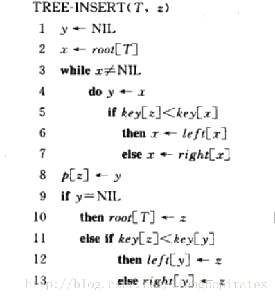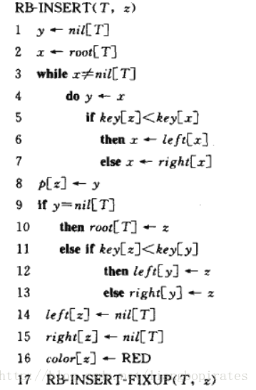 先来看如何插入结点Z,插入很简单的。先把结点Z的左右孩子left[z] 、right[z]和父母p[z]初始化,然后从根结点开始一直向下寻找Z的父母,找到之后就把孩子Z插入,如果是空树,直接把Z当成根结点。 在伪代码中,X初始化为根结点,Y始终是其父母,最后把Z插入。