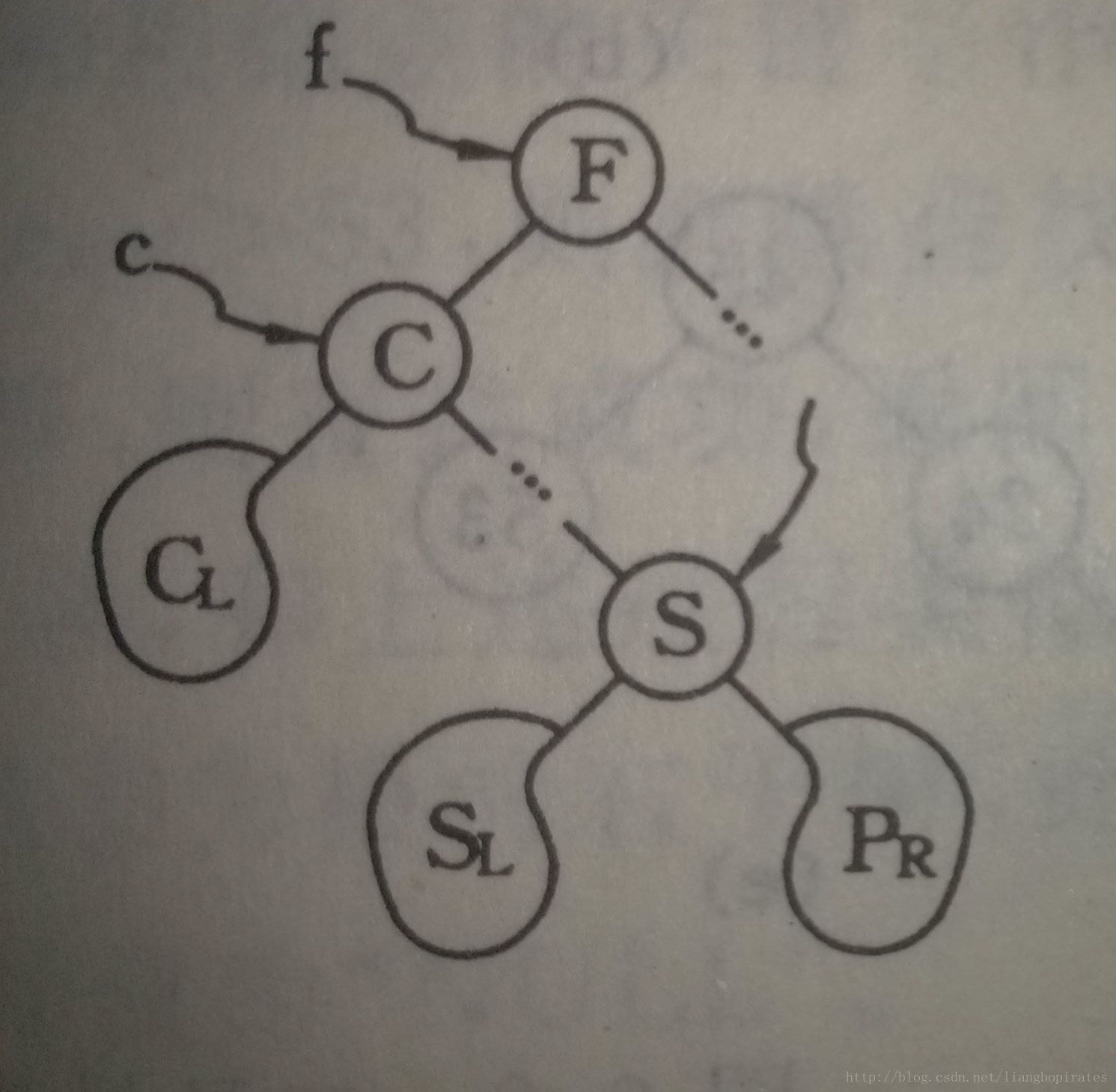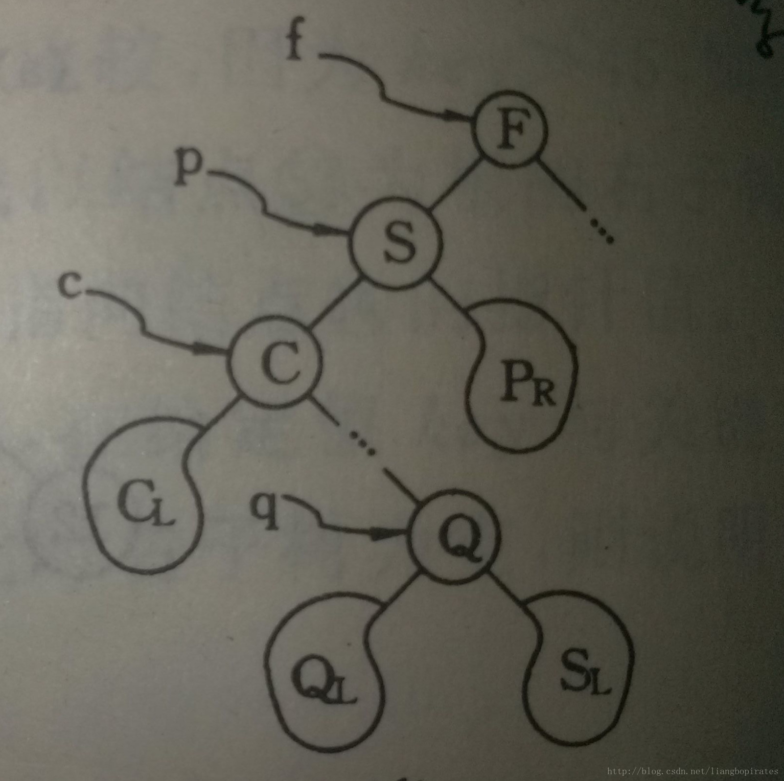 接下来我们看第二种方法,这种方法的好处是不像刚才那么有BUG,不过好像大多数书上举的例子都是第一种,汗。难道第一种比第二种的简单?我们看一下吧 先令P的右孩子PR成为其前驱S的右孩子,然后将P的左孩子C成为P父母F的左孩子,删除P。这样就不用管C是不是其前驱了。C就是其前驱也是把PR给C的右孩子,序列的相对位置是不会发生变化的。