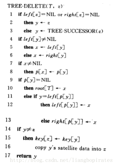 可是真的是这样吗?这是老严数据结构书上的截图,算导上给的是找后继结点,然后和上边说的一样,就是把刚才的前驱换成后继。 可是我想说的是这里忽略了一种情况,那就是如果前驱是其左孩子了怎么办?根据之前分析的前驱分类,在这里要删除的结点P肯定有两个孩子,那么对于前驱来说就只有两种情况,如果P前驱是左孩子的最右结点,刚才的分析没有一点问题,可是如果P前驱是其左孩子,也就是说左子树根结点没有右子树。那么按刚才的分析 就是说不通了。前驱S是P的左孩子,你还要把S的左孩子变成S的父母(P)的右孩子吗?那之前P的右孩子岂不是丢了??!! 所以这个时候你要判断一点就是P前驱是否是P的左孩子,就是在找前驱的时候保留一个指针指向前驱的父母,最后判断是否和P相等,如果相等就把P左孩子的左孩子变成P的左孩子,然后P的左孩子(此时也是前驱)覆盖P。如果不相等,就按刚才说的做。 算导给的,和这是一样的,只不过是对称找后继,如果后继是其右孩子也是尴尬。也可以和刚才一样,留个指针判断。 我们要分类判断,如果判断得到P的前驱是其左孩子的话,那么直接将前驱取代P就好了,其他什么都不用做。或者像算导上说的找后继,后继是其右孩子的话就让后继取代他。也就是说如果一个结点的前驱或者后继是其孩子的话,直接让其孩子取代他就好了,很简单的,其他什么都不用做。 不能想当然的以为前驱一定是左孩子的左右结点,后继一定是右孩子的最左结点。这样就算是前驱不是其左孩子,只要后继是其右孩子,就让右孩子取代他,两个孩子满足一个就可以减少很多的处理,优化算法,而且此时不必留指针再判断了。如何判断呢?如果P的左孩子没有右子树,那前驱就是左孩子。如果他的右孩子没有左子树,那后继就是其右孩子。 伪代码 TREE-DELETE(T,z) 1 if left[z]=NIL or right[z]=NIL 2 then if left[z]=NIL 3 then p[right[z]]=p[z] 4 left[p[z]]=right[z] 5 else if right[z]=NIL 6 then p[left[z]]=p[z] 7 left[p[z]]=left[z] 8 else if right[left[z]]=NIL 9 then key[z]=key[left[z]] 10 p[left[left[z]]]=z 11 left[z]=left[left[z]] 12 else if left[right[z]]=NIL 13 then p[right[right[z]]]=z 14 right[z]=right[right[z]] 15 else 16 then y=left[z] 17 while right[y]≠NIL 18 y=right[y] 19 p[left[y]]=p[y] 20 right[p[y]]=left[y] 21 key[z]=key[y]