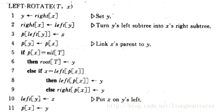 当在某个结点x上做左旋操作时,我们假设它的右孩子y不是NIL,x可以为RB树内任意右孩子而不是的结点。旋以x到y之间的链为“支轴”逆时针旋转,它使y成为该子树新的根,而y的左孩子b则成为x的右孩子。而右旋和左旋是对称的。Y的右孩子X也不是NIL,这时候以y到x之间的链为“支轴”逆顺时针旋转,使x成为新的子树的根,x的右孩子变成y的左孩子。因为左右对称,这里我们只给出左旋的伪代码。假设X的右孩子不等于NIL,而且根的父母结点是NIL。