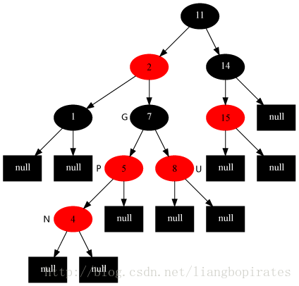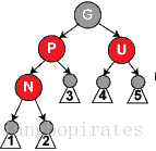 此时我们可以把U和P都变成黑色,但是此时以祖父的父节点G为根的子树的黑高度变化了,也即是+1了。这就违反了性质5,唉,千万不敢违反性质5,超级麻烦。所以我们做一个变通,可以把祖父结点G变成红色,此时的违反性质的可能性就落到了G身上,这时就把G当成插入结点N,继续进入调整算法开始调整。 也就是说我们可以把这个插入结点N和父节点P的连续红色的违反情况向上移动,就是把违反性质的结点向上调整,这样直到最后变成根结点是红色的,根结点父节点是NIL[T]黑色,此时直接把根结点变成黑色即可,很nice。