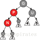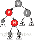 也即是变成了刚才那种情况。所以我们把这种情况称为第二种,刚才说的是第三种。因为第二种到第三种是直接过度的,不是互斥的情况。虽然我们忘了一种情况,那就是叔叔不存在,但是这并不影响我们刚才分析的结果。 情况二:如果父节点P是红色而叔父节点U是黑色或不存在,并且插入节点N是其父节点P的右孩子。我们以P-N为轴进行一次左旋调换插入节点N和其父节点P的角色(不是颜色)。