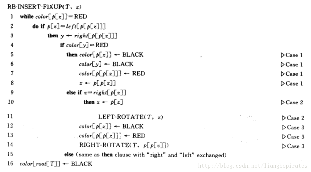 情况三::如果父节点P是红色而叔父节点U是黑色或不存在,并且插入节点N是其父节点P的左孩子。我们可以把P重绘为黑色,并重绘G为红色。然后以P-G为轴以进行一次左旋调换节点P和节点G的角色。 情况一要进入继续调整,最坏的情况是向上调整到根。情况二直接进入情况三。情况三调整完了之后调整算法就结束了。 上伪代码,这个伪代码和刚才分析的是一样的,如此同时还是只有半边代码,就是只有父节点P是祖父结点G的左孩子的情况。不过在伪代码里,插入结点是z,y是其叔叔。 INSERT伪代码
