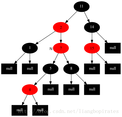算法为什么就结束了呢?因为调整的前后左边的子树的黑高+1了,所以此时N的多一层黑色就没用了,要舍弃。就是说我们解决了黑高的问题,性质5保持住了。