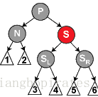 当然这只是假设,我们假想的,不过这有助于我们解决问题。这个黑+黑结点是X结点,他的颜色属性还是黑色,只不过用一个指针指向他,他便多了一层黑色。不断调整的过程,会出现新的X结点,这时候指针指向的结点不一定会是原来的X了,不过还是会多一层黑色。而且在不断旋转的过程会出现旋转前后两边子树黑高发生变化的情况,此时如果N这边的子树黑高+1了,那N头上的多于黑色就没有了,舍弃。这就是我们的最终目的。这也就是调整的麻烦之处,接下来我们看看他如何麻烦。当然这还是要分类的。这里我们只考虑结点X是其父节点左孩子的情况,对称的情况不再讲。我们假设占用被删除结点的位置的结点是N,N的兄弟结点是S,N的父亲结点是P,S的左孩子是SL,S是右孩子是SR。要明确一点的是S不是NIL[T],因为如果是NIL[T],那两边的黑高现在就不一样,即便是没删除之前,RB-TREE也不会出现这种情况的。