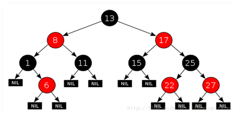 这里我们主要是说一个特殊的平衡二叉树,那就是红黑树RB-TREE。RB-TREE的好处在于检索很快,主要用于关联式容器。Set map multiset multimap的底层实现都是RB-TREE,这些关联容器存入的时候都是自动排序,查询的时候都是很快。不过代价就是RB-TREE树的插入和删除带来的麻烦很多,不过还好的是 它可以在O(log n)时间内做查找,插入和删除。 红黑树在每个结点上增加一个存储位表示结点的颜色,可以是Red或Black。每一个结点有5个域:color key left right p。如果某个结点没有孩子或没有父结点,则把相应的结点设为NIL,颜色BLACK。 红黑树是每个结点都带有颜色属性的二叉查找树,颜色为红色或黑色。在二叉查找树强制一般要求以外,对于任何有效的红黑树我们增加了如下的额外要求(性质): 性质1. 每个结点只能是红色或黑色。 性质2. 根结点是黑色。 性质3. 所有叶子结点都是黑色(叶子是NIL结点)。 性质4. 每个红色结点的两个孩子结点都是黑色。(从每个叶子到根的所有路径上不能有两个连续的红色结点) 性质5. 从任一结点到其每个叶子的所有简单路径都包含相同数目的黑色结点。 通过对任何一条从根到叶子的路径上各个结点着色方式的限制,红黑树确保没有一条路径会比其他路径长出俩倍,因而是接近平衡的。