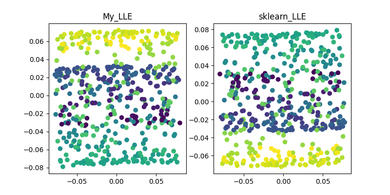 由图2-5可知,自行编写的LLE降维算法在降维之后的效果略逊于sklearn中提供的接口,后面的实验中都是直接调用LocallyLinearEmbedding再调参,以下给出自行实现LLE算法的步骤以及LocallyLinearEmbedding参数意义。