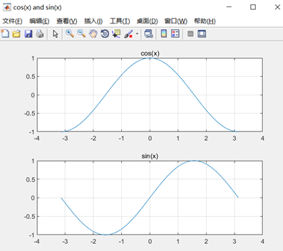 subplot(2,1,1), plot(x, cos(x)); grid on; title("cos(x)");