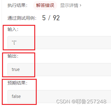 根据上图的信息我们得知输入的是“[”,也就是*s为‘[’,进入while语句,紧接着进入if语句,然后进行入栈,++s,此时的*s为 '\0',跳出while循环,最后执行return true;所以才会输出true。但是只有一个括号是不可能匹配的,应该输出false才对。知道了病因,我们就可以对症下药了。具体怎么解决呢?既然他只有一个左括号,但是会跳出while语句,因此我们可以再while语句下面做文章。如果括号都匹配上了,那栈里面应该是没有元素的,所以我们可以在while语句执行完成之后再对进行判空,栈为空就说明都匹配上了,如果栈里面还有落单得到括号。那就肯定没有匹配上。