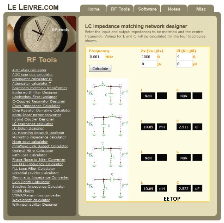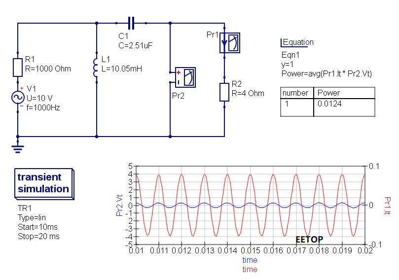计算这种匹配网络的最简单方法是使用在线计算工具。比如www.leleivre.com上有一个不错的 工具 ( 见图 4)。我在这里输入了设计数据:1-kHz 频率、1-kΩ 源和 4-Ω 负载。然后该工具给出了两个 LC 网络。第一种配置使用一个 2.5uF 并联电容器(接地)和一个串联 10mH 电感器。第二个使用相反的配置。我选择了后者并将其添加到仿真图中( 见图 5)。你可以仔细检查。我在源侧保留了一个 1 kΩ 电阻器和一个 4 Ω 负载。然后我添加了 L1 = 10 mH 和 C1 = 2.5µH。仿真表明负载中消耗的功率现在从 0.197 增加到 12.4 mW。请记住,这正是我们在完美匹配的 1kΩ 负载下得到的!