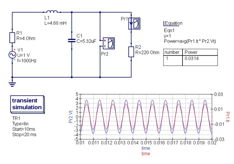 到目前为止,我已经证明了 LC 网络可以将高阻抗转换为较低的阻抗,但它也可以以另一种方式工作。在 图 6中,我以 ±1-V 源为例,仍为 1 kHz,内部电阻为 4-Ω,并通过正确的 LC 匹配网络将其连接到 220-Ω 负载,使用相同的在线工具计算,模拟表明它有效。输出功率为 31.4 mW,这是可能的最大值。你可以自己检查。这似乎并不奇怪,但请再次查看 图 6 并关注波形。匹配网络后,电压接近±4-V PP. 这高于 ±1 V 的输入电压。其他地方没有电源。该电路是完全无源的。这意味着这种从低到高的阻抗网络实际上正在增加信号电压。这与升压转换器非常相似。电感器和电容器构成一个谐振网络,从而增加电压。当然,电路不会提高输出能量,电压升高,但电流相应降低。