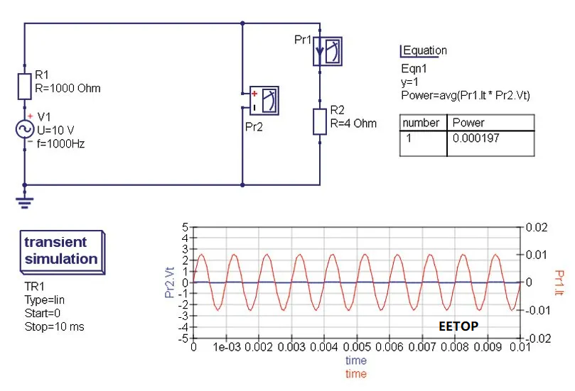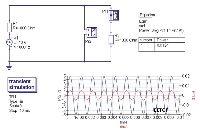 现在举个例子,假设你有一个幅度为 ±10-V 且串行阻抗为 1-kΩ 的 1-kHz 正弦信号源。如果要从中提取尽可能多的功率,则必须使用电抗为 0 的 1kΩ 负载。我使用免费的 QUCS 电路模拟器为你做了一个小型模拟( 见图 2)。示波器通过两个虚拟仪表向你显示施加在负载电阻上的电压和电流波形。此处的电压为 ±5 V(因为源电阻和负载电阻均为 1 kΩ,分压器为 2),电流为 ±5 mA。我添加了一个小方程来计算负载中消耗的 RMS 功率(在本例中为 12.4 mW)。这是你可以从该来源获得的最大值。