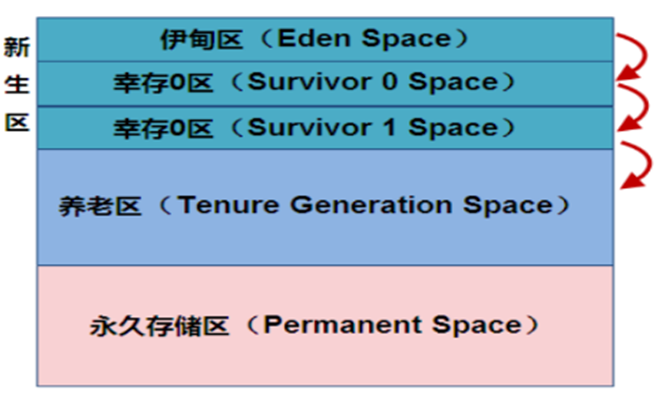 新生区是类的诞生、成长、消亡的区域,一个类在这里产生,应用,最后被垃圾回收器收集,结束生命。新生区又分为两部分:伊甸区(Eden space)和幸存者区(Survivor pace),所有的类都是在伊甸区被new出来的。幸存区有两个:0区(Survivor 0 space)和1区(Survivor 1 space)。当伊甸园的空间用完时,程序又需要创建对象,JVM的垃圾回收器将对伊甸园进行垃圾回收(Minor GC),将伊甸园中的剩余对象移动到幸存0区。若幸存0区也满了,再对该区进行垃圾回收,然后移动到1区。那如果1去也满了呢?再移动到养老区。若养老区也满了,那么这个时候将产生Major GC(FullGCC),进行养老区的内存清理。若养老区执行Full GC 之后发现依然无法进行对象的保存,就会产生OOM异常“OutOfMemoryError”。