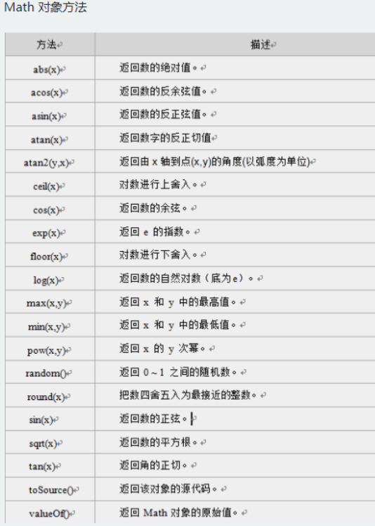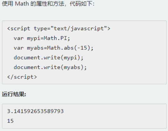 注意:Math 对象是一个固有的对象,无需创建它,直接把 Math 作为对象使用就可以调用其所有属性和方法。这是它与Date,String对象的区别。