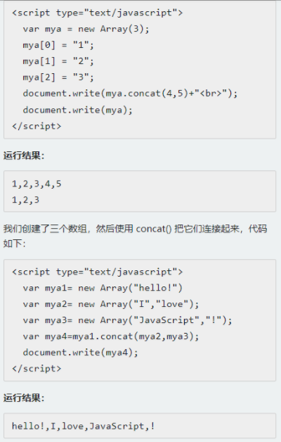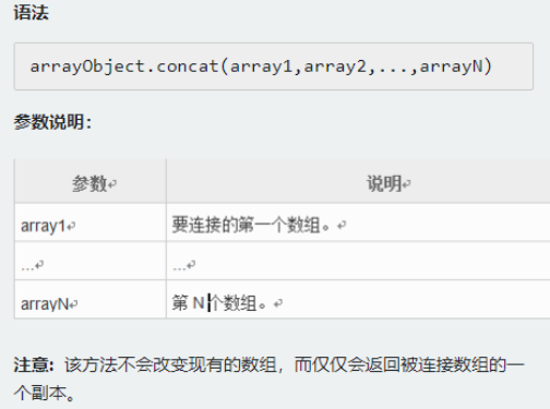 concat() 方法用于连接两个或多个数组。此方法返回一个新数组,不改变原来的数组。