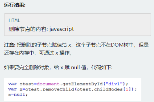 removeChild() 方法从子节点列表中删除某个节点。如删除成功,此方法可返回被删除的节点,如失败,则返回 NULL。