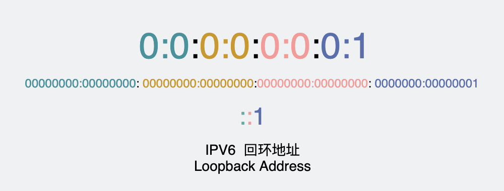 在IPV4下的回环地址是 127.0.0.1,在IPV6下,表达为 ::1 。中间把连续的0给省略了,之所以不是7个 冒号,而是2个冒号: , 是因为一个 IPV6 地址中只允许出现⼀次两个连续的冒号。