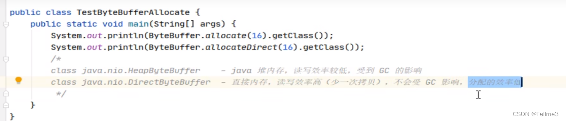 2、allocateDirect:直接内存:读写效率高(少了一次拷贝(我们的直接内存不受gc的影响。所以就不会去拷贝移动数据嘛)(内存是固定的,读写效率高,但是要去调用操作系统的函数去分配内存。所以分配内存的效率会低))