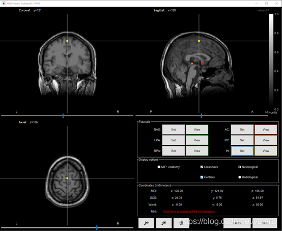 在MRI查看器中,定位NAS(鼻根),左耳 (LPA),右耳 (RPA),前连合 (AC),后联合(PC),半球间点 (IH),我们默认您已经具备了这些定位的相关知识,在此不过多赘述,brainstorm内部已经舍弃了acpc相关坐标,仅作为ctf坐标系的辅助。Brainstorm导入的MRI图像为freesurfer文件夹中的T1.mgz,由于步骤1中,我们已将该图像配准到acpc坐标系下,因此world坐标系原点即为ac点,尽管acpc定位不会对brainstorm产生过多影响,我们仍建议您这么做