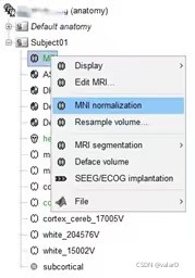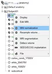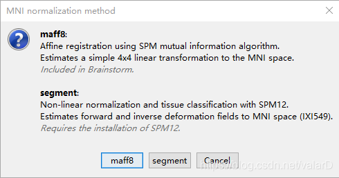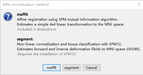 右键MRI-MNI normalization,将坐标注册到MNI空间中。在弹出的窗口中选择maff8,此方法嵌入在 Brainstorm 中,不需要安装 SPM12,它基于与 SPM 软件中的 MNI ICBM152 模板的仿射联合配准