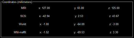 这种标准化不会修改解剖结构,它只是保存了一个转换,可以在头脑风暴坐标和 MNI 坐标之间进行转换。计算此转换后,我们可以在MRI 查看器中看到某点的MNI坐标