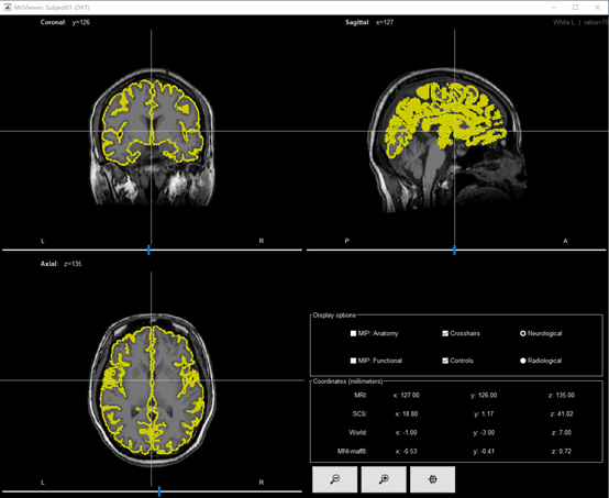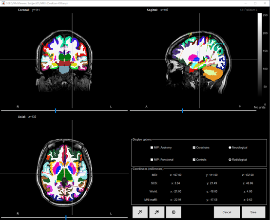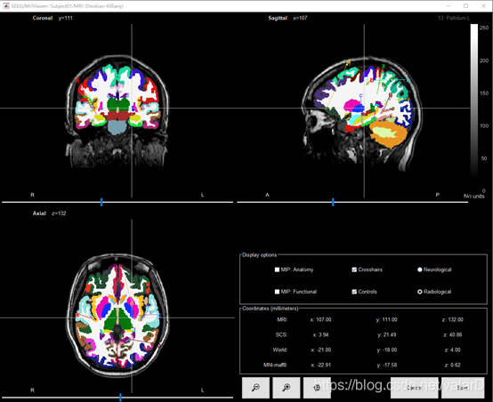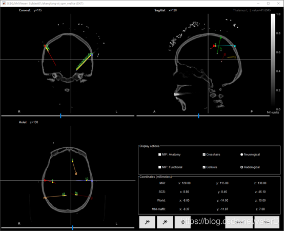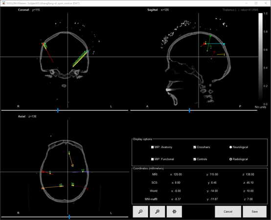 在这一步中,您可以同时打开MRI图像与病例对照以获得电极位置的参考,由于MRI图像与CT图像已经配准,因此两个图像电极的坐标完全相同。在MRI查看器中,您可以通过Neurological/Radiological选项,在神经科医生和影像科医生的影像查看习惯中切换,以符合病例的左右方向