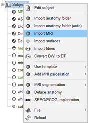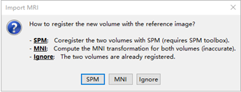 右键Subject-Import MRI,选择CT图像,弹出窗口均选择默认选项,在Registration: How to register the new volume with the previous one?窗口中,我们通常选择第一个选项SPM,用 SPM 工具箱来估计从CT图像到MRI的变换,若您已经在其他地方(如fieldtrip)已将CT与MRI共同注册配准,这里也可选择Ignore