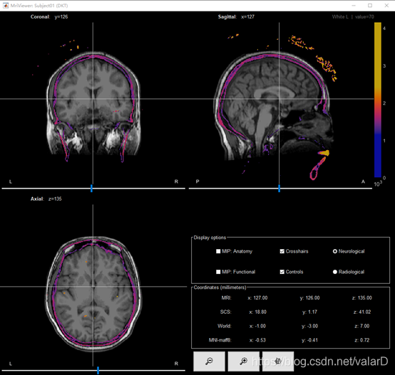 MRI查看器会自动打开,CT图像会作为彩色层覆盖到MRI图像,我们可以在此查看两个图像的配准是否准确