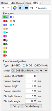 Subject中将会创建新的implantation文件夹,并开始编辑一个空的channel文件。在brainstrom窗口的右侧,iEEG选项卡下,我们可以添加电极(+符号)并设置其模型,请根据患者电极植入的相关信息,添加相应数量的电极,并设置电极长度、触点间距等信息。在本示例中,共有14根植入电极,其中4号(d)为长电极,其他均为短电极。默认情况下,触点直径略大于电极直径,否则有可能会导致触点的显示错误