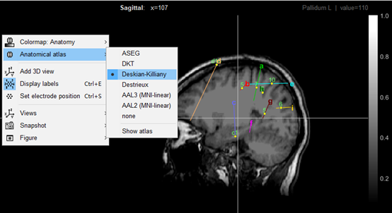 切换回电极信息页面,右键SEEG/ECOG,在MRI查看器中查看电极,可以看到,MRI查看器右上角已经显示光标位置所在区域,右键空白处-Anatomical atlas可以切换当前所使用的分区,“Show atlas“选项可以在MRI图像上以不同颜色显示各个分区。通过iEEG选项卡切换电极,可以很方便地查看各个位置所在的区域