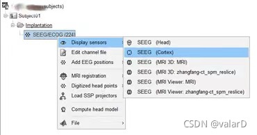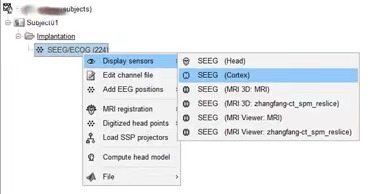 右键SEEG/ECOG,选择在皮层模型下查看电极,以大致检查电极位置是否正确,在查看器中,每个触点都可被选中,右键触点可查看其详细信息