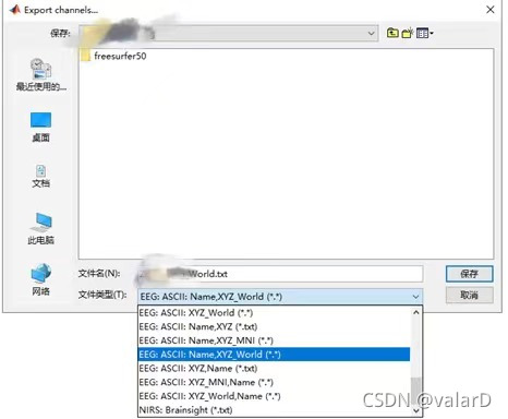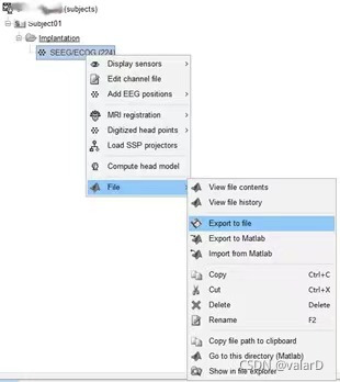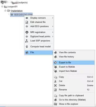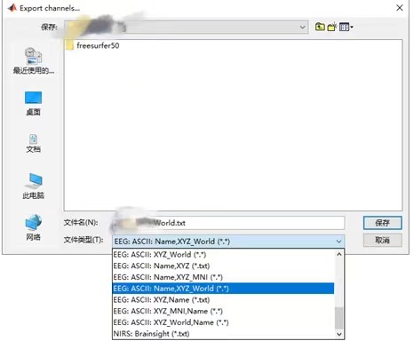右键SEEG/ECOG-File-Export to file,将电极触点信息导出,在文件类型中选择EEG:ASCII:Name,XYZ_MNI导出MNI坐标,选择EEG:ASCII:Name,XYZ_World导出World坐标,由于我们使用的是已经过acpc配准的图像,因此World坐标也就是acpc坐标。导出的坐标是两个txt文件